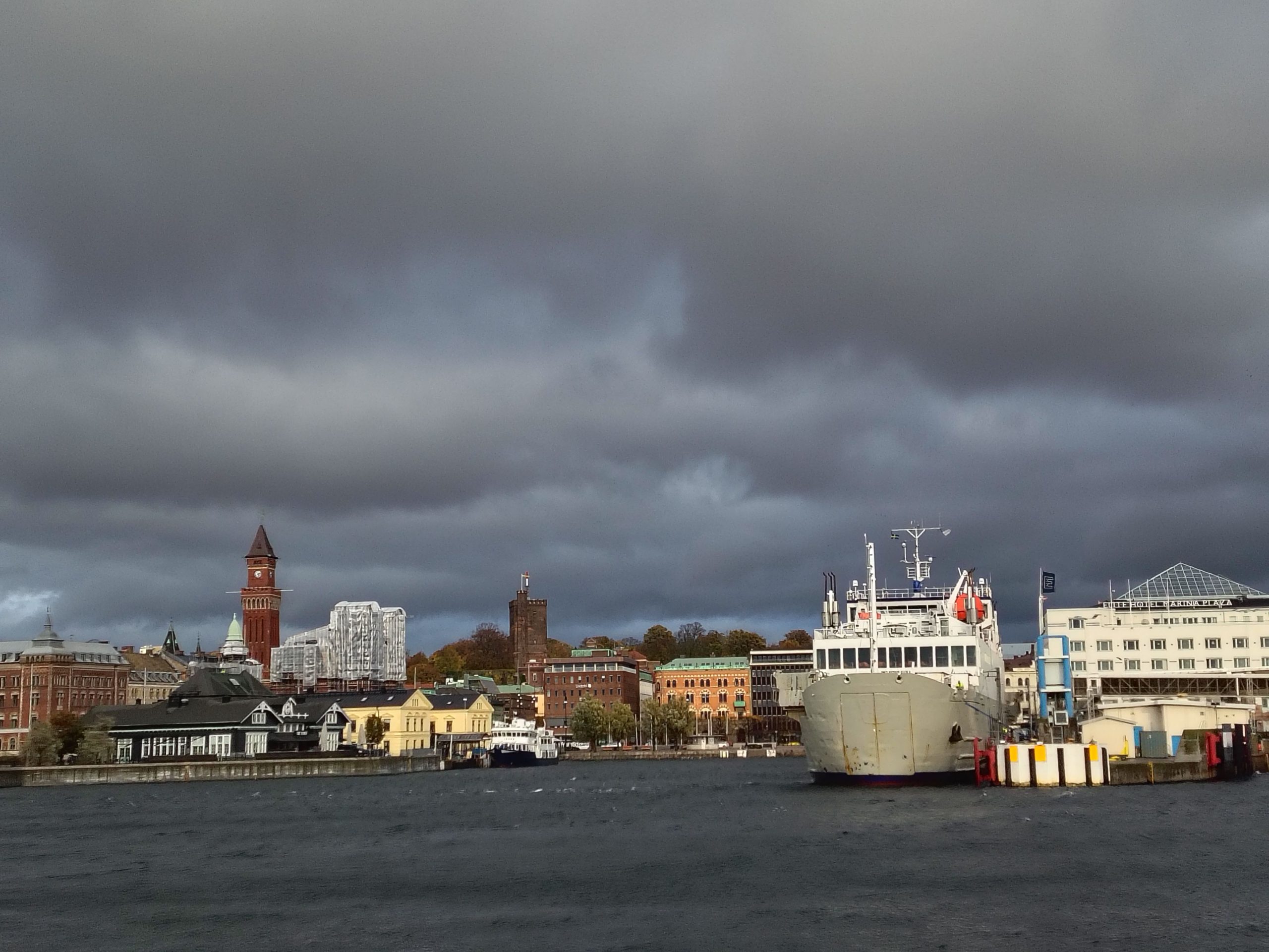 Helsingborg med Rådhuset och Kärnan med gamla Färjestationen i förgrunden på sin nya plats. Vi har haft så många dagar med regn nu i slutet av oktober. Och med inplanerad operation, men också akut sjukdom med flera dagars vistelse på lasarettet. Oktober har varit en trist månad på flera olika sätt. Men den 31 oktober vaknade vi till strålande sol!