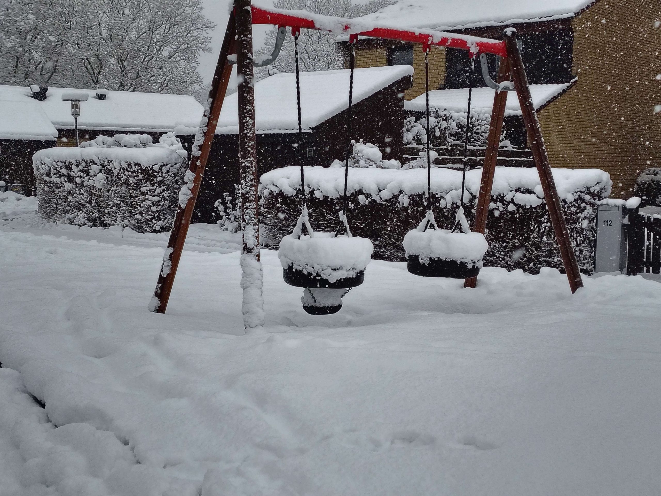 Snön har lockat ut barn och vuxna som verkligen har haft roligt, de vuxna har väl inte ropat så högt när det skottade snö. Så här såg det inte ut på eftermiddagen då var det upptrampat på lekplatsen. Några små snöhögar hade barnen att klättra i.