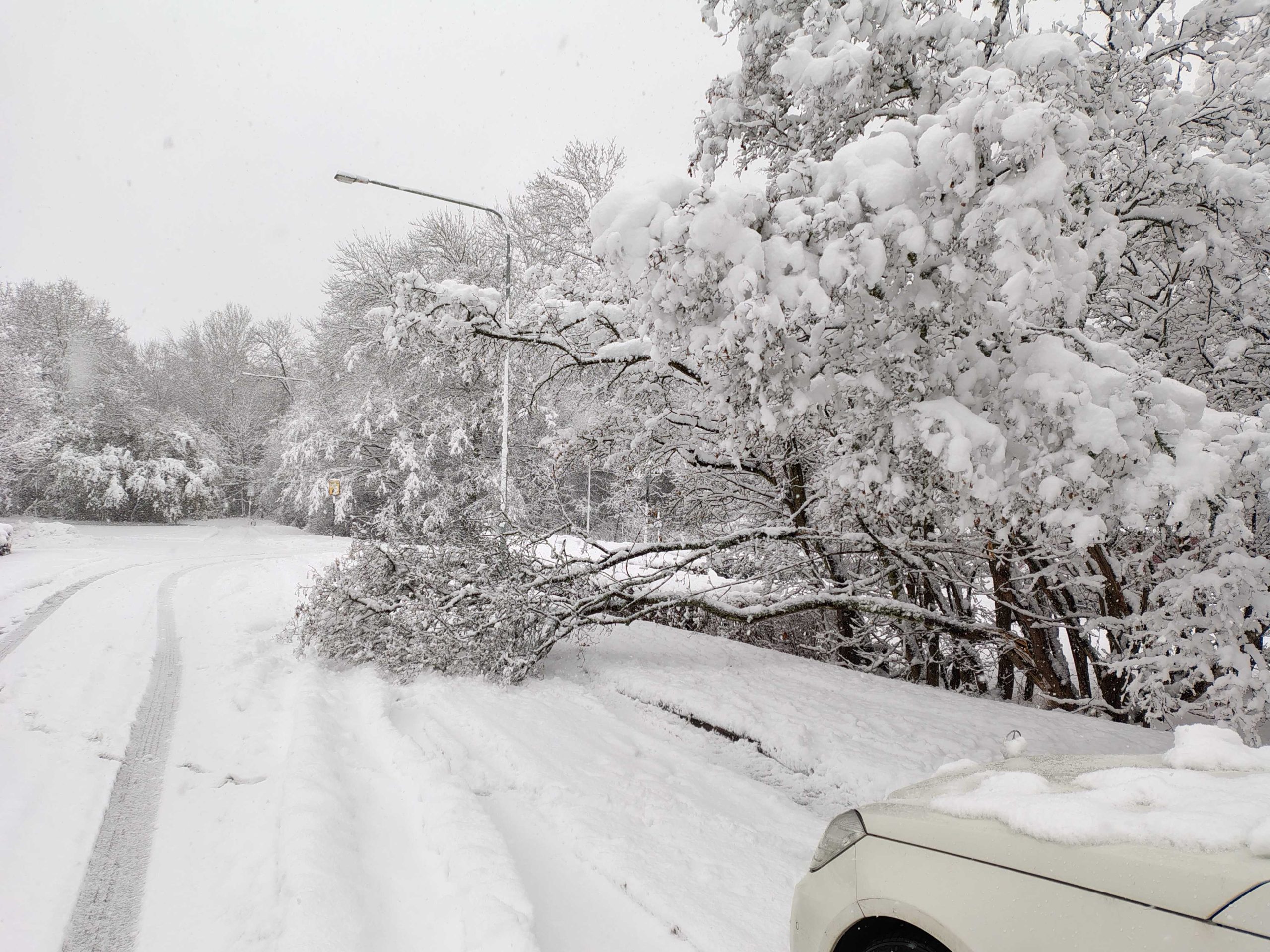 Tung snö som tynger ner grenarna så de till och med går av.
